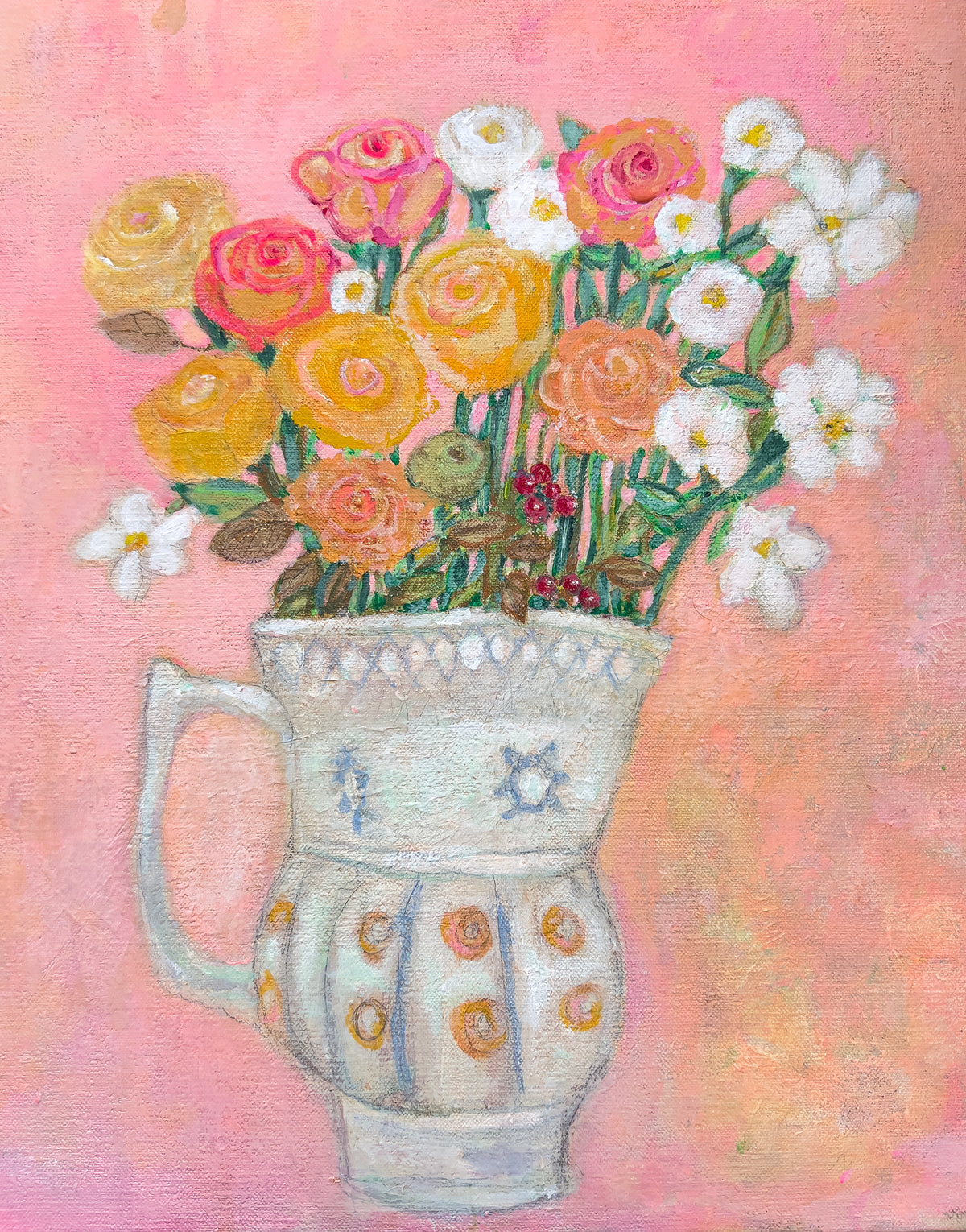 This delicate Rose painting of my favourite David Austin rose has a naïve charm and quiet detail. Its simplicity makes it deeply personal . A timeless piece I’ll always treasure.
